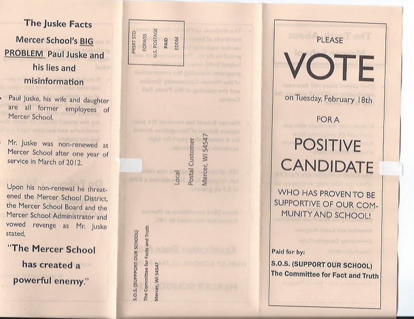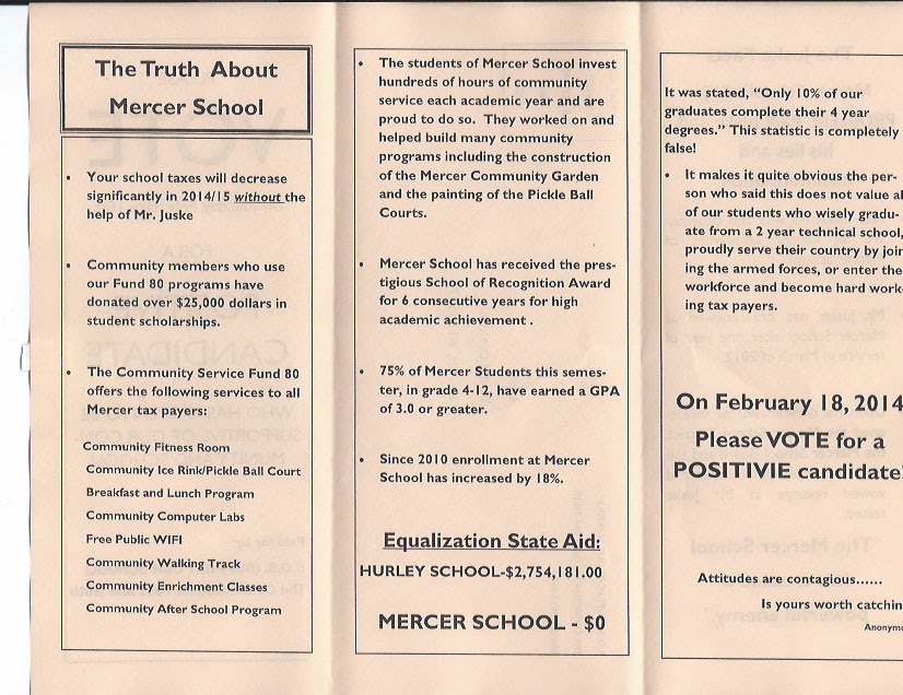 Deanna Pierpont, Mercer School Board treasurer has requested that we reproduce the flyer sent to Mercer residents by candidate Paul Juske. It appears below.